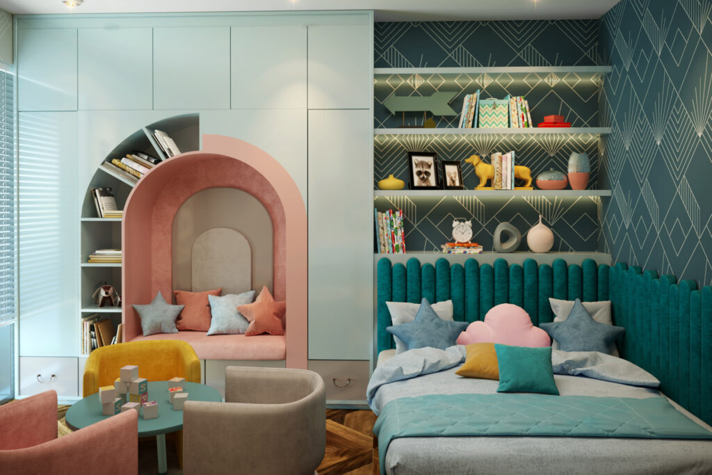 نخصص منطقة لعب داخل الغرفة لتوفير مساحة ترفيهية آمنة داخل المنزل. كما نختار الأرضيات المناسبة التي تقلل من الصدمات وتضيف أجواء من المرح